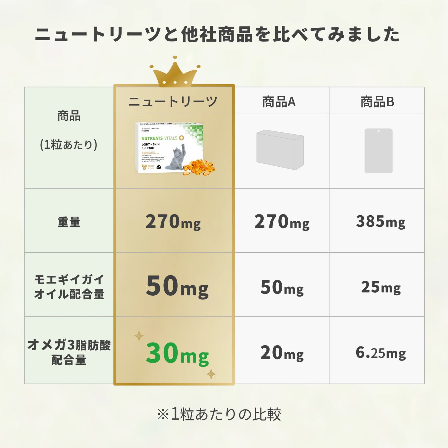 A. 独自の製造方法で抽出することにより1粒あたり30mgのオメガ3を含んでおり、一般的なサプリと比べても高い配合量となっています。
